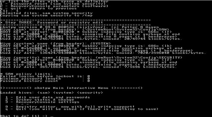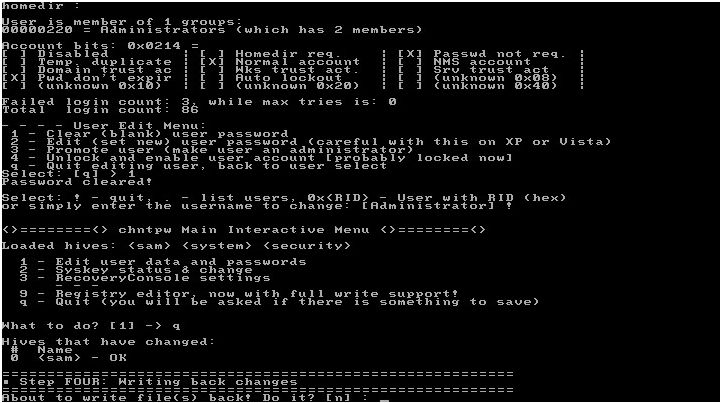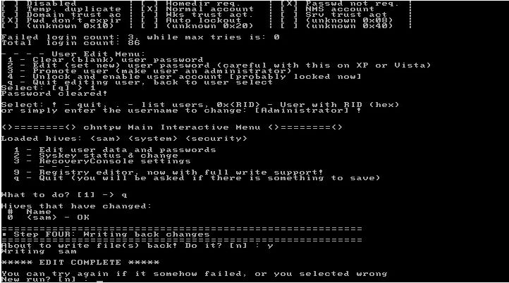 Odata ce am iesit, reintram in meniul de baza, unde sintem intrebati din nou ce operatiuni mai dorim sa facem. Daca nu mai dorim sa schimbam sau sa stergem alte parole, pentru alti useri, apasam q (pentru quit)
