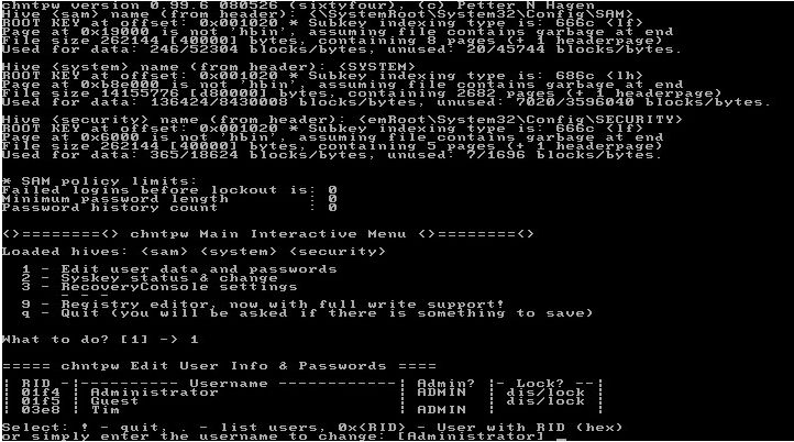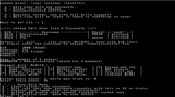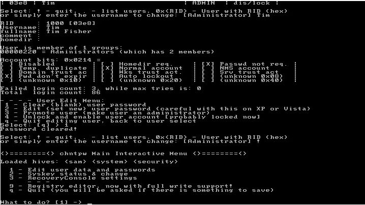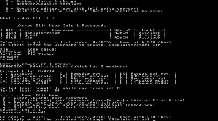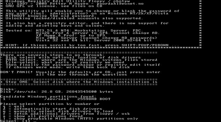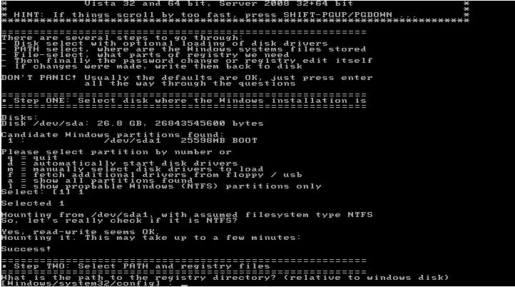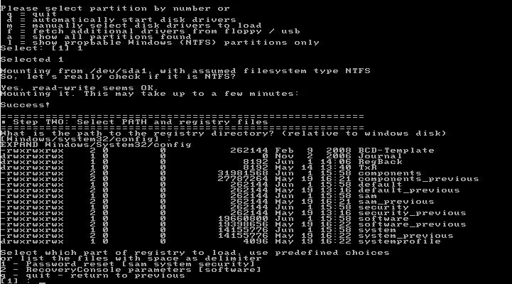 Dupa ce l-am anuntat pe om ca-i voi rade parola aminului, am luat utilitarul cel mai indicat pentru asa ceva. Se numeste "Offline NT Password and Registry Editor" si poate fi gasit aici: http://pogostick.net/~pnh/ntpasswd/. Se scrie fisierul .iso pe un CD, dupa care boot-am de pe el, asteptam sa se incarce sistemul si sa fim intrebati pe care din partitiile gasite se afla Windows-ul.